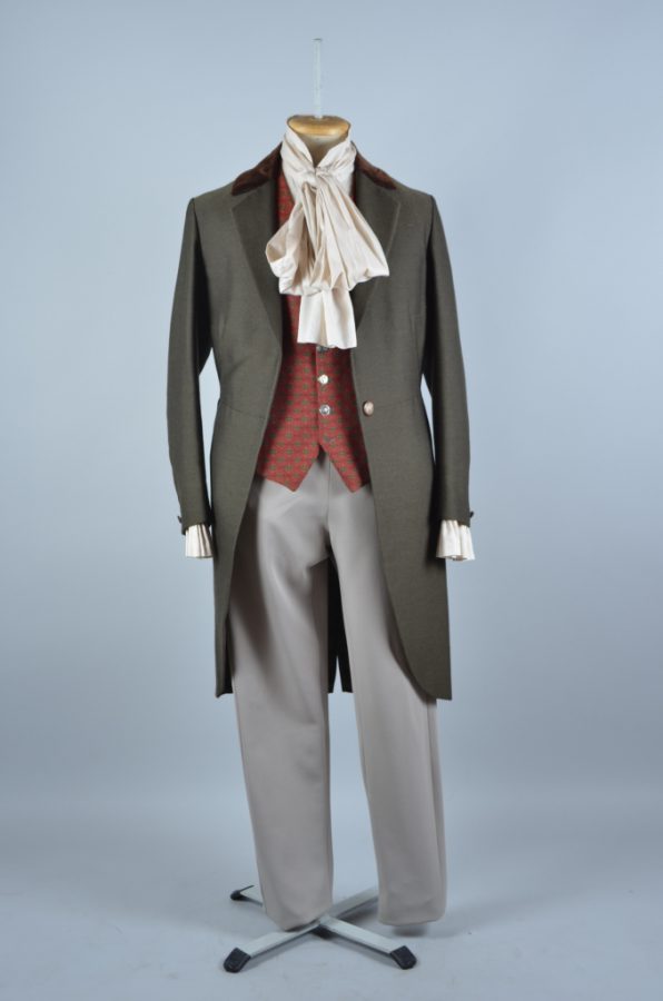 Groen/bruine jas,beige strakke broek,beige overhemd,rood vest,beenkappen,hoge hoed.