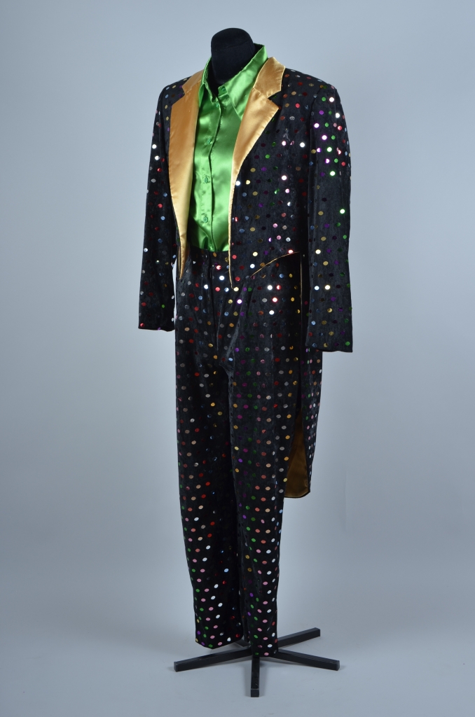 Rokjas,broek van gekleurde nageltjesstof,satijnen overhemd