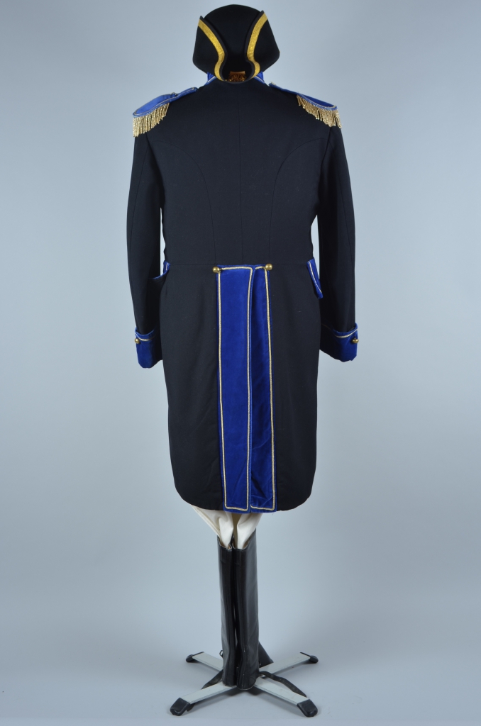 Kostuum bestaat uit: jas, broek, beenkappen en hoed.