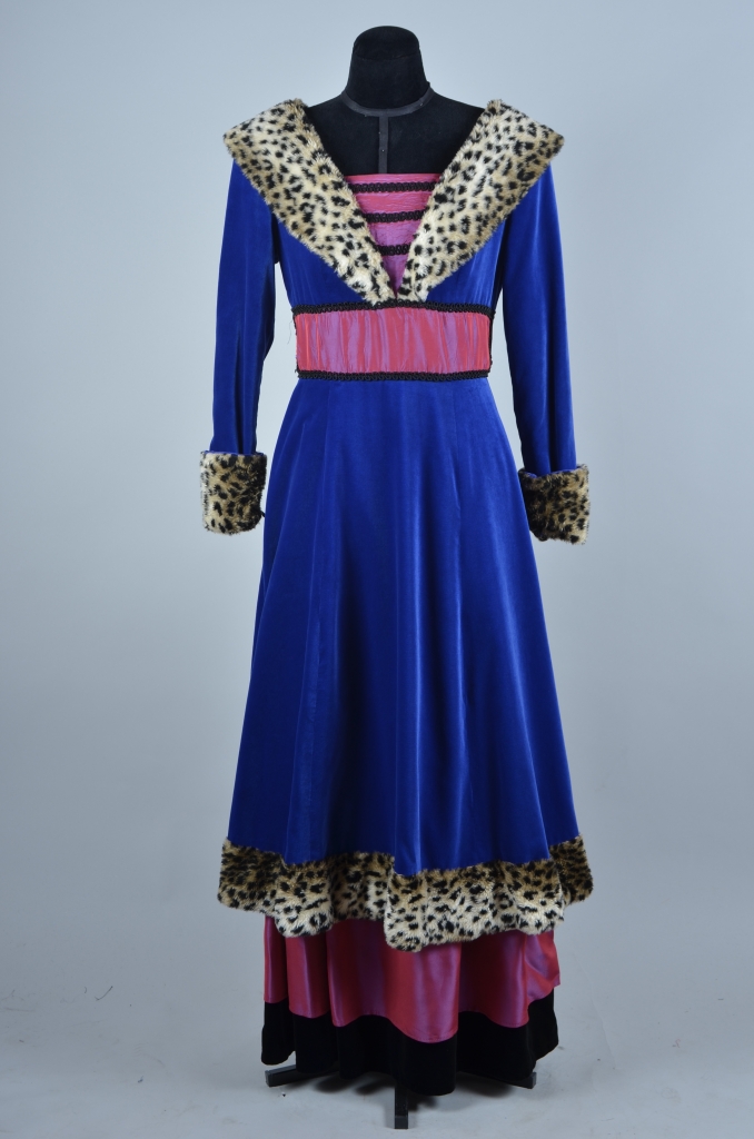 Lange blauwe fluwelenjurk en onderrok,afgezet met bont(tijgerprint), lijfje,taille en onderrok van rose satijn.